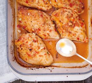 Bake until the chicken is cooked through and golden (about 30 minutes).