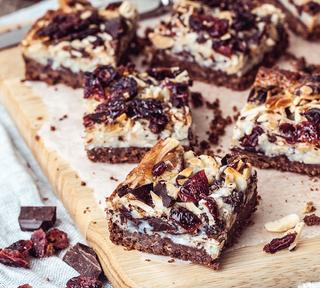 Sprinkle coconut, chocolate, almonds and cranberries or raisins evenly over the base.