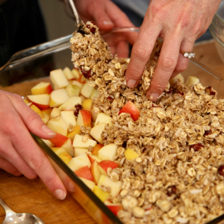 Berry and Apple Crumble — for the filling, use 4 apples, peeled, cored and sliced, and 3 cups fresh or thawed frozen berries.