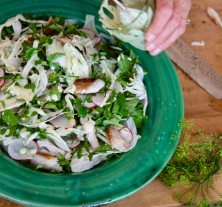 Use a mandoline or a very sharp knife to slice the fennel and radishes as thinly as possible. The dill dressing can be made up to 6 hours ahead.