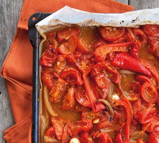 Prepare the tomatoes, capsicums and onion and place them in a large roasting dish lined with baking paper. They need to be in a single layer so they roast and caramelise rather than stew, so use two roasting dishes if necessary.