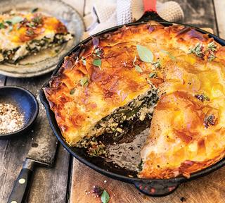 A tasty filling of leafy greens, herbs and cheese is encased in crispy filo to make an updated version of spanakopita that's easy to transport right there in the frypan!