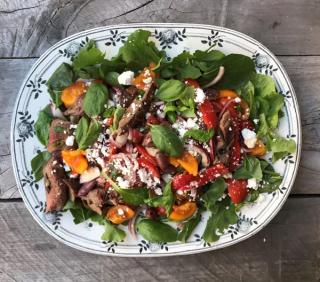 This salad is served at room temperature, which is handy if you don’t want to be rushing around at the last minute. To prepare it ahead of time, cut up the vegetables and herbs, cover and chill. If yo want, you can cook the meat up to about an hour before serving then combine all the ingredients just before serving.