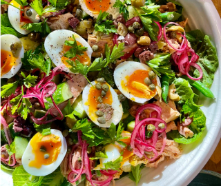 Rose always thought she didn’t like Niçoise salad, until she ate this. Use the best quality tuna you can find. If tuna’s not your thing, use anchovies or sardines. If fish isn’t your thing, you could leave it out and instead add two more eggs, and use olive oil in place of tuna oil. This is also delicious with poached chicken breasts.