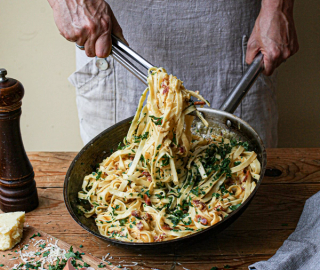 This dish is all about not overcooking the pasta and not letting the egg cook to a scramble once it’s added — the egg should coat the pasta like a creamy sauce. Use cream instead of water for a richer sauce.
