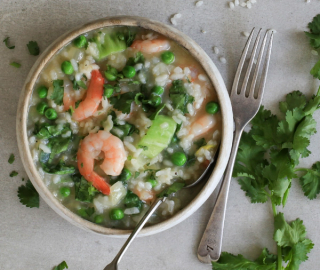 This recipe takes a cooking method from one culture and applies it to ingredients from another. Adding Asian flavours to risotto sounds unlikely but it’s a twist that really works — it’s wonderfully light and zesty.