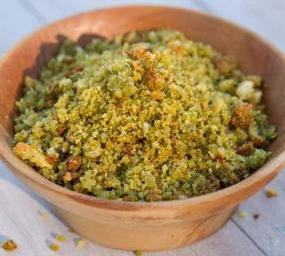 We like to make this tasty crumb in bulk and freeze it in bags to add an instant flavour burst to my famous Chicken and Leek Gratin, cauliflower cheese or silverbeet/swiss chard gratin.