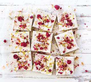 Cut into pieces and top with freeze-dried fruit, coconut and lime zest before serving.