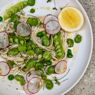 To serve, divide the pasta between bowls and top with sugar snap peas and broad beans/peas.