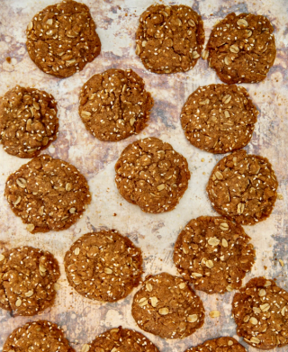 These deliciously sweet cookies are a new take on the beloved Anzac biscuit. As with all baking, you need to be fussy with measuring everything correctly. When we were recipe testing we discovered that if you have a rounded or heaped tablespoon of honey your cookies will spread out very thinly.