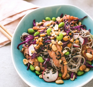 Keep a packet of dried soba noodles in the pantry and a bag of shelled edamame beans in the freezer for the speedy assembly of this power-food salad next time you pick up some salmon from the fishmonger. You can use cooked or thinly sliced freshest raw salmon to make this vibrant salad. A couple of good-quality cans of salmon can also be used instead of fresh salmon.