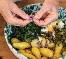 Place the sliced potatoes in a pot with ¼ tsp salt and water to cover. Bring to a gentle boil, then strain and set aside to cool.