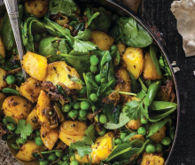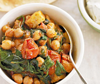 Add chickpeas and halloumi or paneer and cook 2-3 minutes to infuse spice flavours.