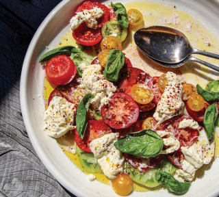When you’re ready to serve, working over the plate of tomatoes, tear the burrata into small chunks, making sure any dripping cream goes onto your plate.